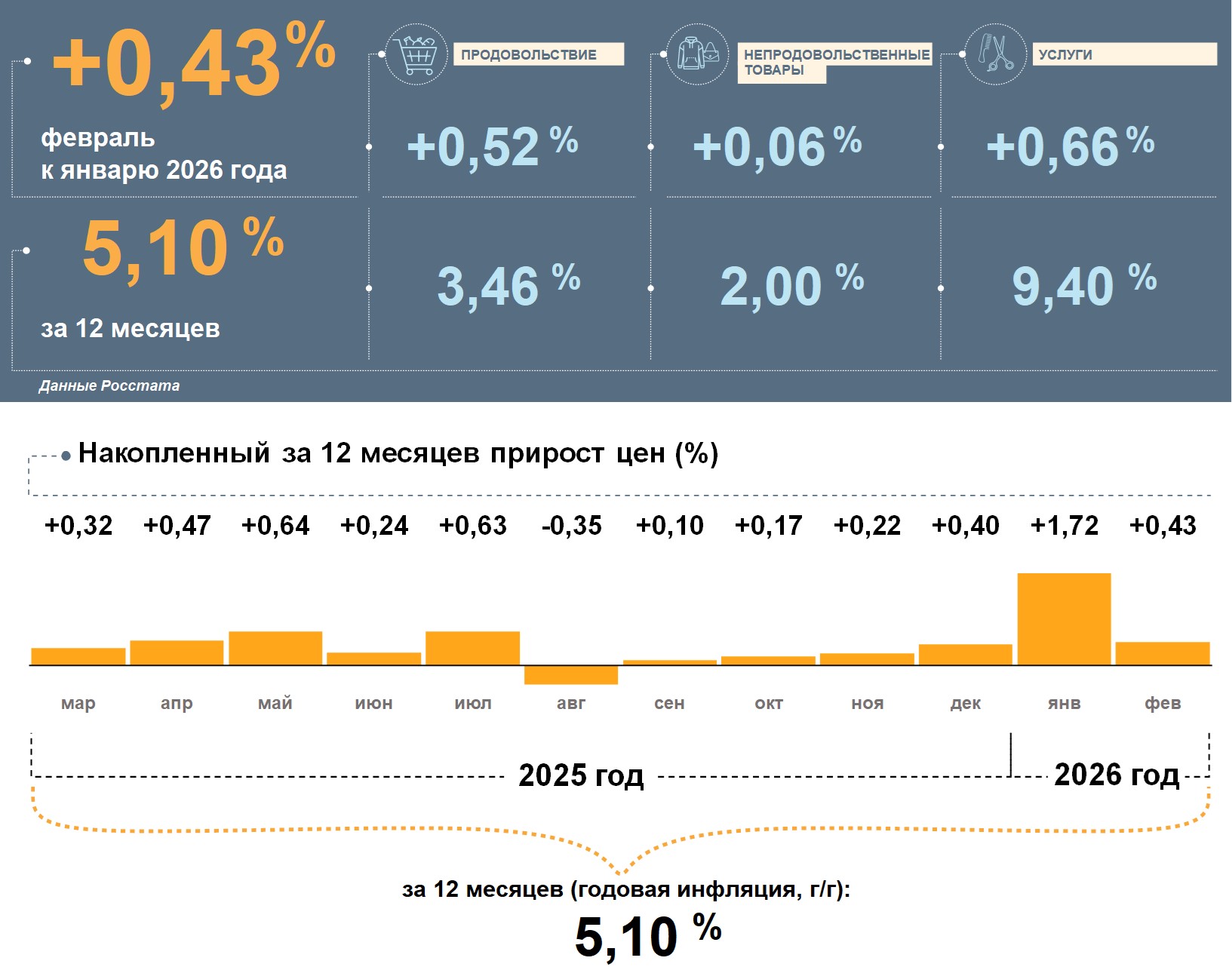 Цены в Москве в феврале 2026 года, по данным Росстата, выросли на 0,43% к январю 2026 года. Годовая инфляция в феврале составила 5,10%. Это ниже, чем в целом по стране (5,91%).