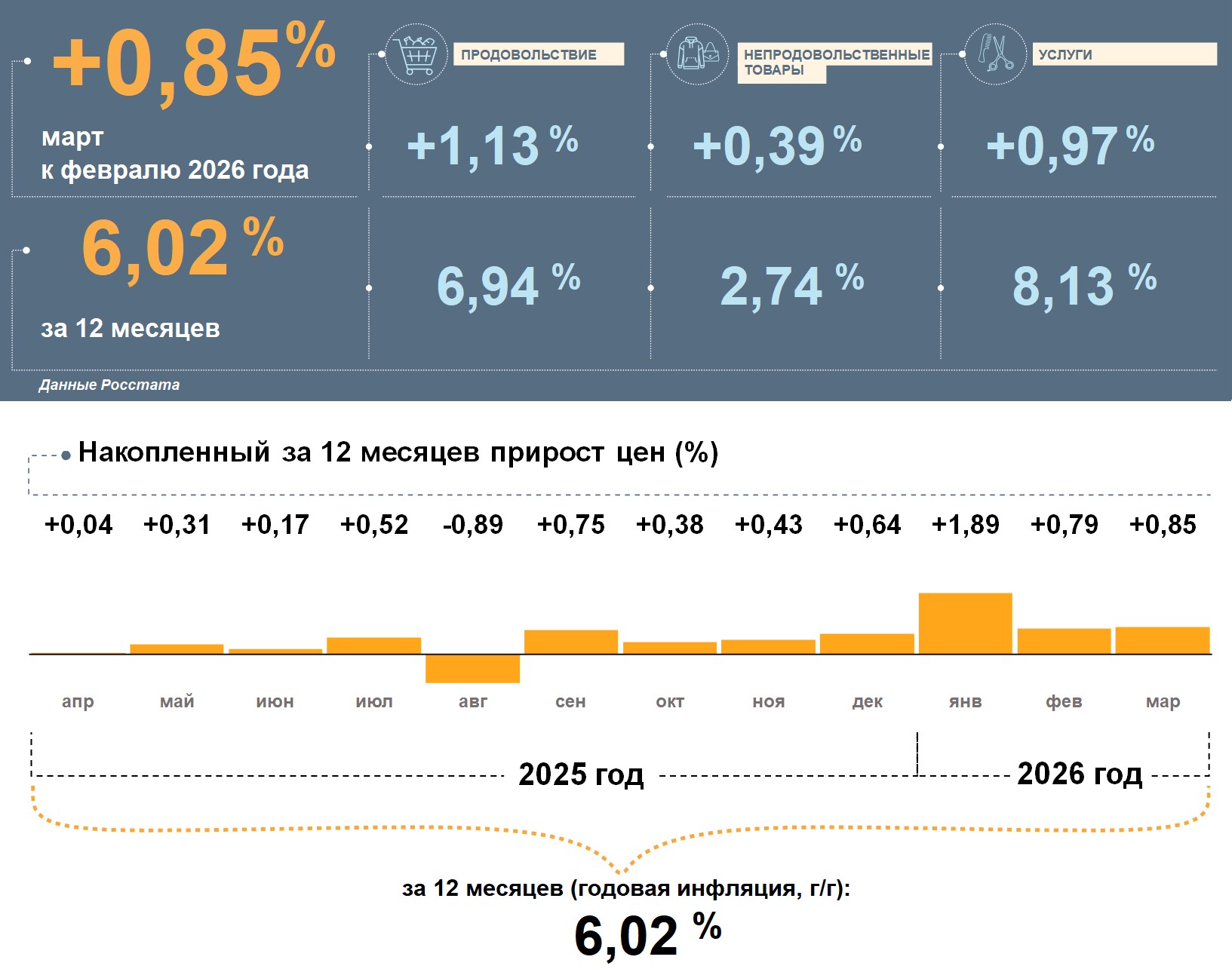 Цены в Ставропольском крае в марте 2026 года, по данным Росстата, выросли на 0,85% к февралю. Годовая инфляция ускорилась и составила 6,02%. Это выше, чем в целом по стране (5,86%).