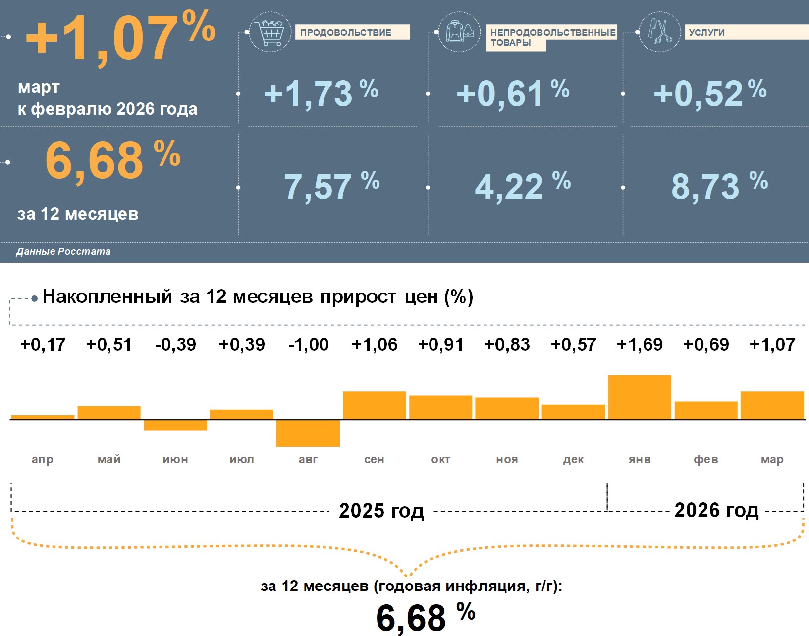 Цены в Республике Северная Осетия‑Алания в марте 2026 года, по данным Росстата, выросли на 1,07% к предыдущему месяцу. Годовая инфляция ускорилась и составила 6,68%. Это выше, чем в целом по стране (5,86%).