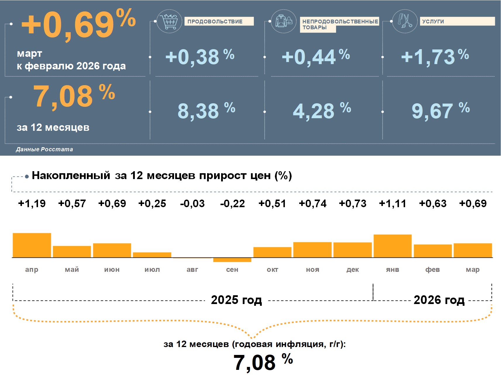 Цены в Калининградской области в марте 2026 года, по данным Росстата, выросли на 0,69% к февралю. Годовая инфляция ускорилась и в марте составила 7,08%. Это выше, чем в целом по стране (5,86%).