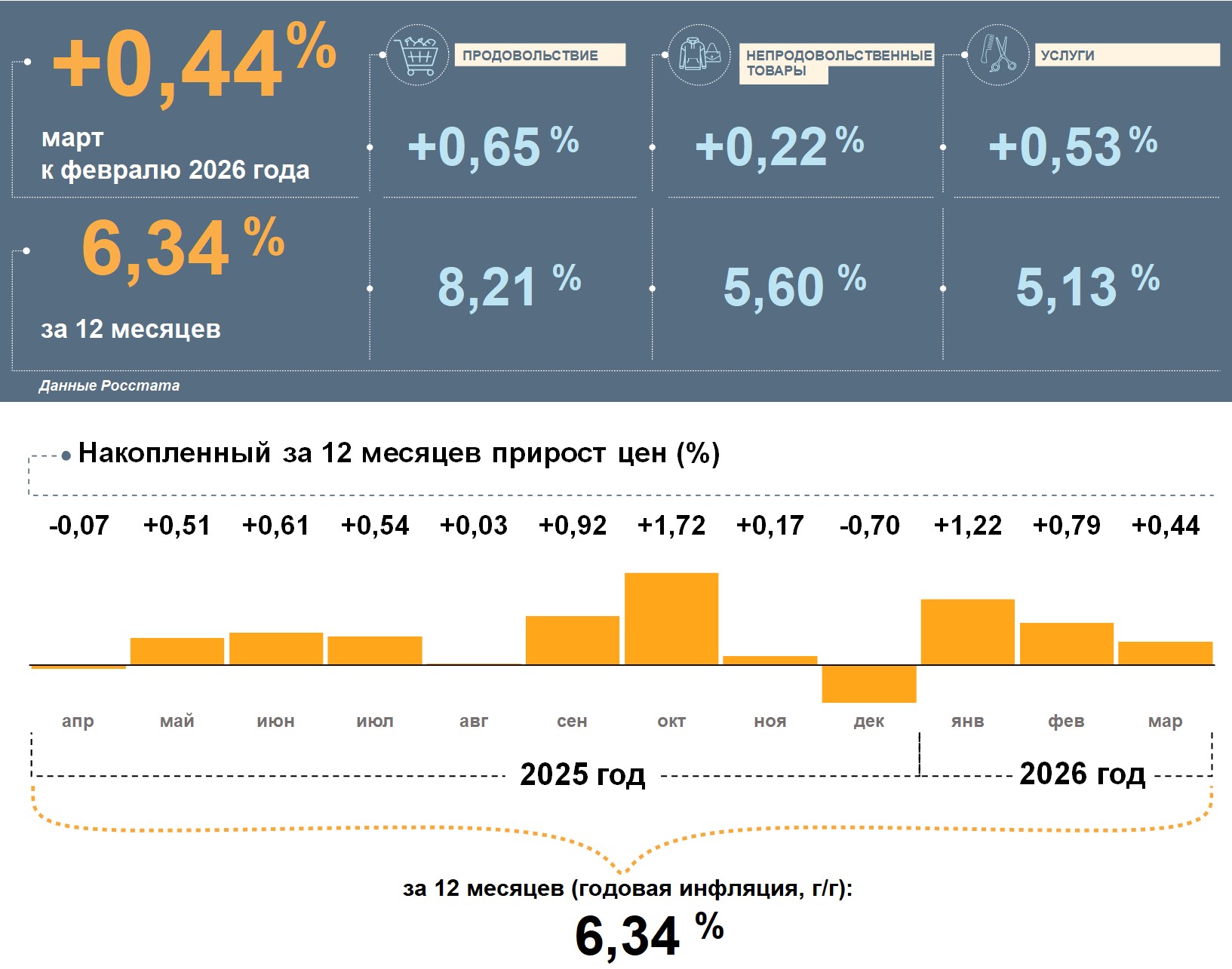 Цены в Республике Тыва в марте 2026 года, по данным Росстата, выросли на 0,44% к февралю. Годовая инфляция продолжила замедляться и составила 6,34%. Это выше, чем в целом по стране (5,86%).