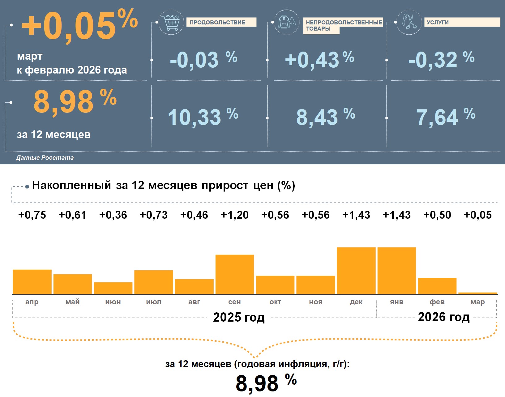 Цены в Камчатском крае в марте 2026 года, по данным Росстата, выросли на 0,05% по отношению к февралю. Годовая инфляция замедлилась и составила 8,98%. Это выше, чем в целом по стране (5,86%).