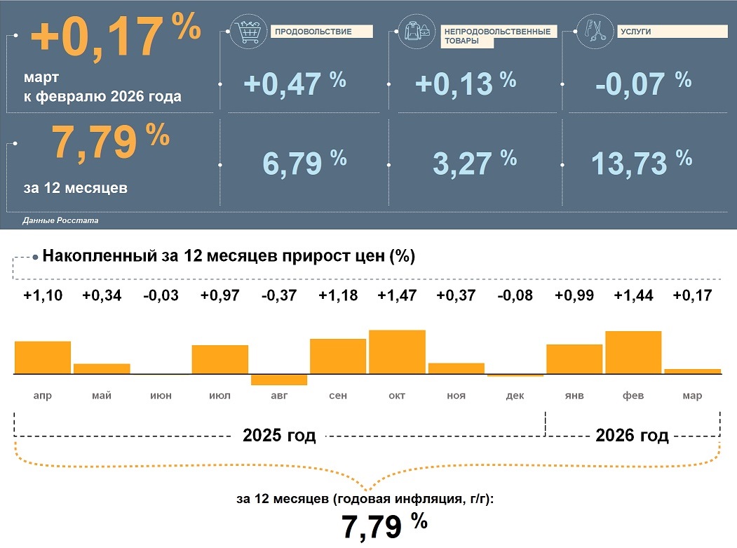 Цены в Магаданской области в марте 2026 года, по данным Росстата, выросли на 0,17% по отношению к февралю. Годовая инфляция ускорилась и составила 7,79%. Это больше, чем в целом по стране (5,86%).