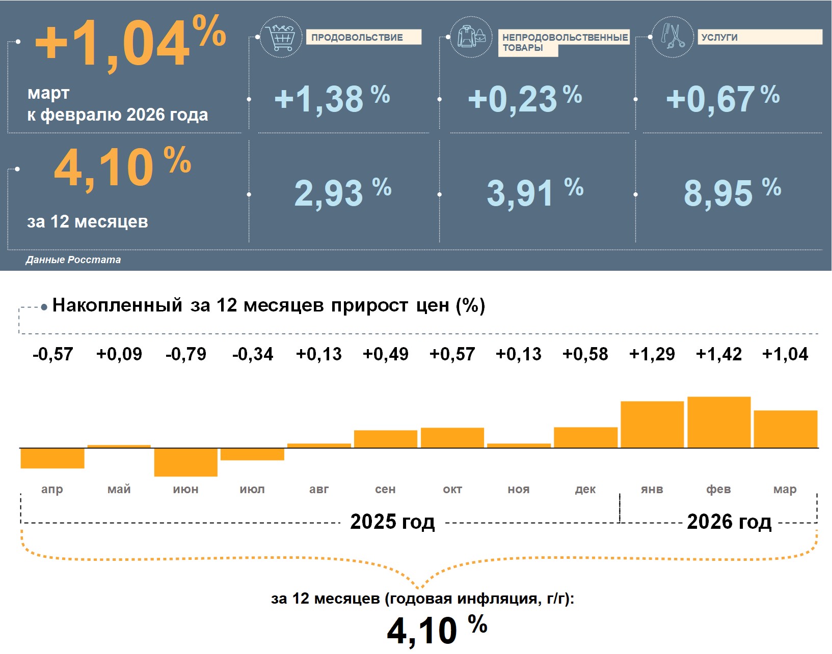 В Республике Дагестан, по данным Росстата, в марте 2026 года цены выросли на 1,04% к февралю. Годовая инфляция замедлилась до 4,10% и осталась ниже, чем в целом по стране (5,86%).