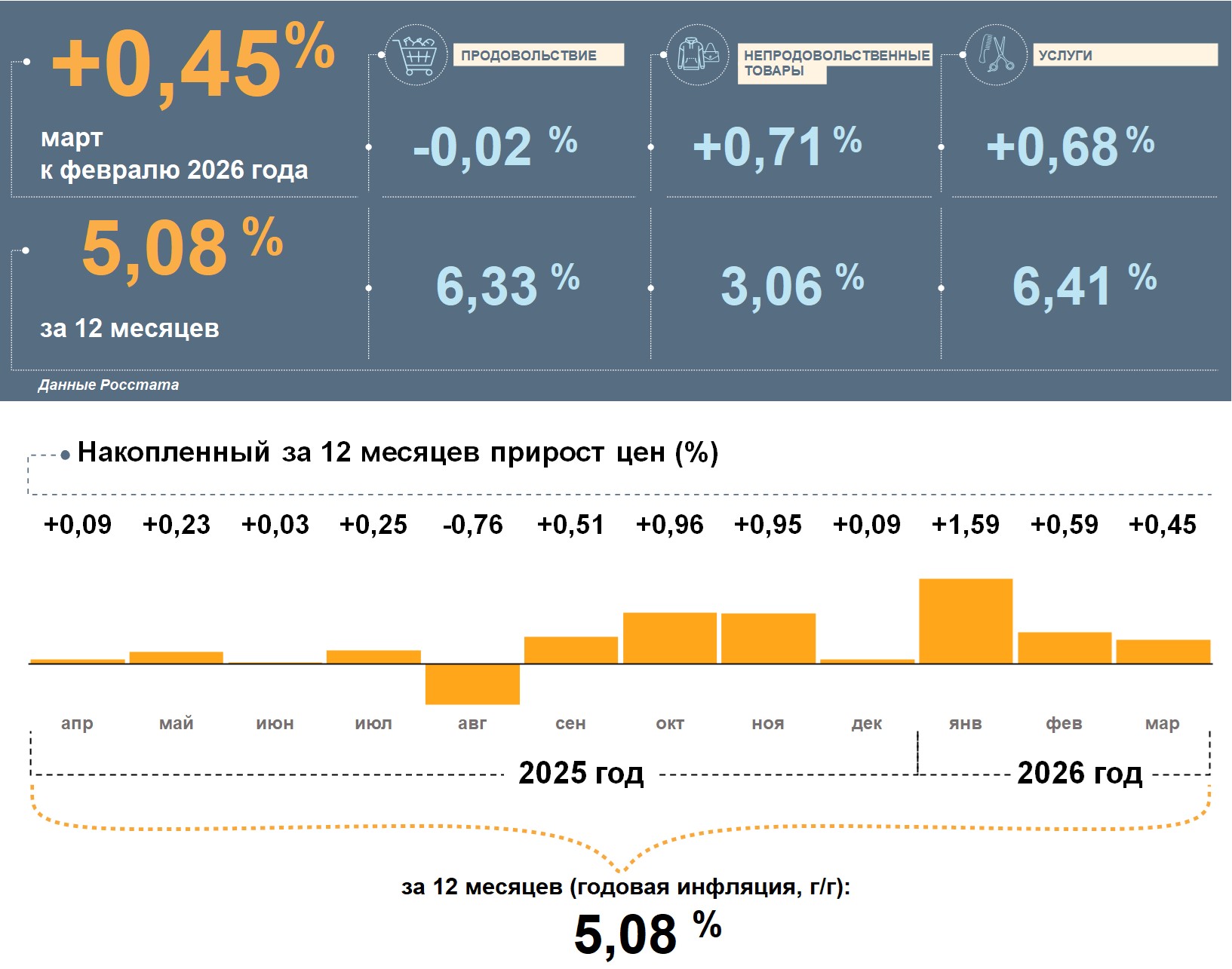 Цены в Ямало-Ненецком автономном округе в марте 2026 года, по данным Росстата, выросли на 0,45% по сравнению с февралем. Годовая инфляция снизилась до 5,08%, продолжая оставаться ниже, чем в целом по стране (5,86%).