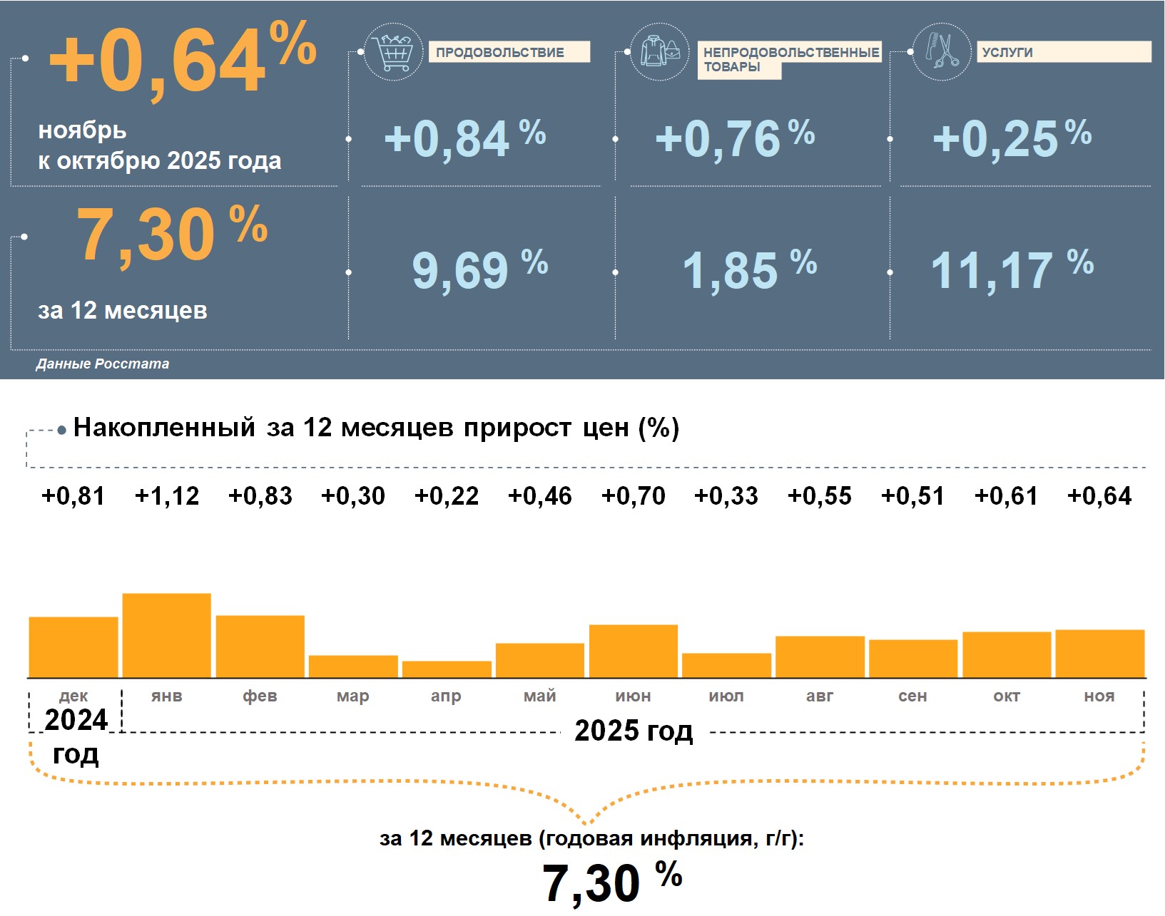 Больше всего в ноябре подорожало продовольствие. Непродовольственные товары заметно выросли в цене, услуги — умеренно. Накопленным итогом за 12 месяцев сильнее всего повысились цены на услуги. Продукты питания за год прибавили в цене больше, чем потребительская корзина в целом, а непродовольственные товары — значительно меньше.