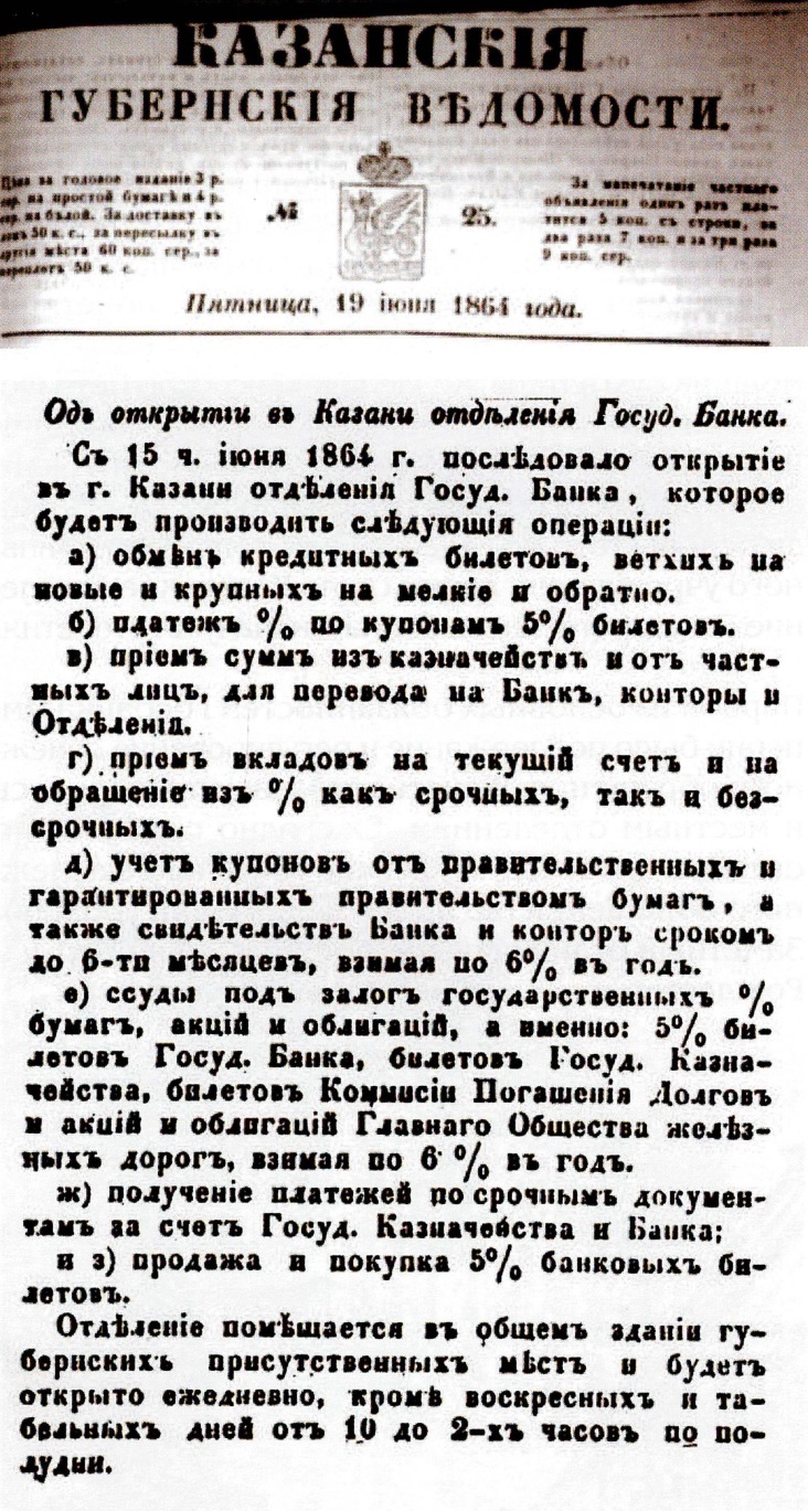Казанская губерния играла важную роль в развитии экономики центральной части России. Развитая торговля и концентрация финансовых средств предопределили быстрый рост банковского капитала. 15 июня 1864 года в Казани в здании губернских присутственных мест в Кремле открылось Казанское отделение Государственного банка. Уездное казначейство приняло на хранение в свою кладовую сундук с деньгами и документами отделения.